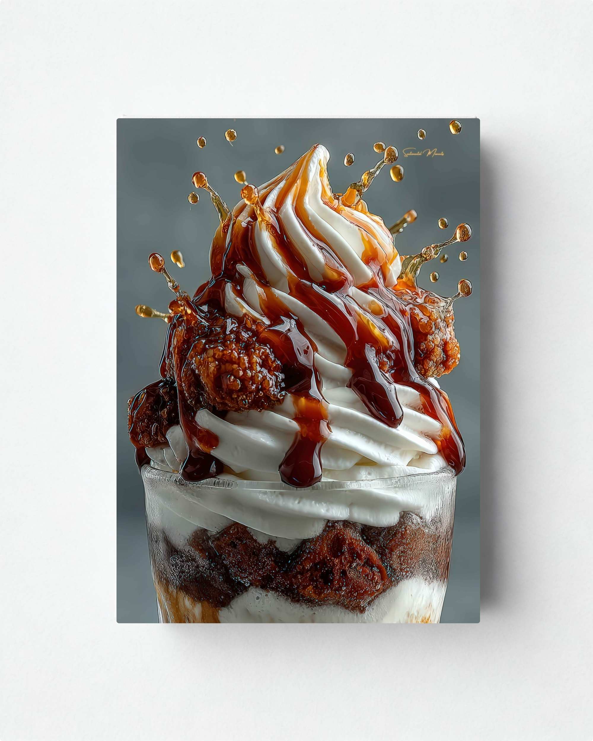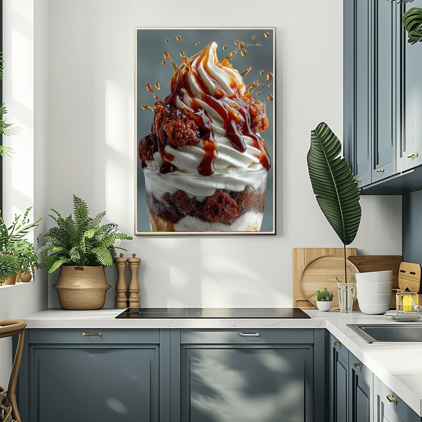 Na grafice widoczny jest realistyczny deser kawowy z karmelem. Zdjęcie ma wysoką szczegółowość, dlatego świetnie prezentuje się w nowoczesnych wnętrzach typu food art. Motyw dodaje energii i buduje przytulny, domowy klimat. Co więcej, pasuje do wielu stylów — od nowoczesnego po loft i klasykę.